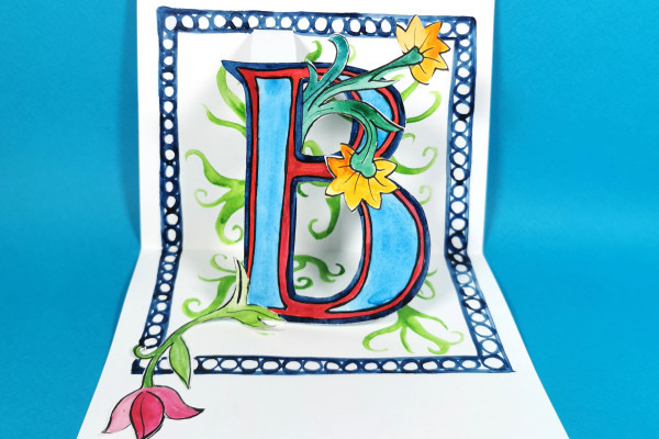 Crée une carte pop-up avec tes propres initiales et décore-la avec différents ornements, fleurs et animaux !